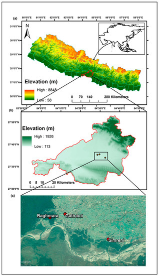 Figure showing (a) map of Nepal in the South Asia region, highlighting the study area in Chitwan district of Nepal; (b) enlarged map of Chitwan district showing the study area; and (c) Google Earth image showing study sites.