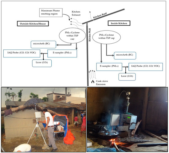 Top panel: schematics of the instrumental setup for cookstove emission measurement inside and outside the kitchen; Bottom right: indoor emission measurement; Bottom left: outdoor escaping emission measurement.