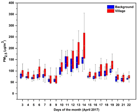 Box plot showing daily variation of PM2.5 (µg/m3) concentration for background (blue shade) and village (red shade). The upper and lower edge of each box represent the 75th and 25th percentiles, respectively; the top and bottom of the whisker represent the 90th and 10th percentiles, respectively. The square box mark within each box represents the average PM2.5 concentration and the horizontal mid-line in each box represents the median.