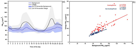 (a) Plot showing diurnal variation of PM2.5 concentration (µg/m3) for background (blue line) and semi-rural site (black line). The light blue shade and light gray shade represent the 25th and 75th percentiles of background and semi-rural sites concentration respectively. (b) Scatter plot between semi-rural sites and background level concentration during both cooking and non-cooking hours. Blue dots represent the non-cooking hour and red dots represent the cooking hours with linear fit, with blue and red line respectively for non-cooking and cooking hours.