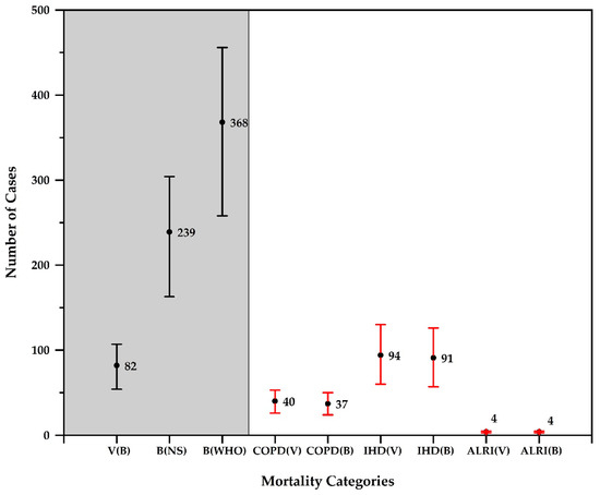 Premature mortality due to PM2.5 for different causes (with high and low range) during the study period. V (B), B (NS), B (WHO), COPD (V), COPD (B), IHD (V), IHD (B), ALRI (V), and ALRI (B) represent mortality averted (shaded portion) and mortality caused (non-shaded portion). Where, V(B) is mortality averted when village concentration lowered to background level. B(NS) is mortality averted when background concentration lowered to NAAQS of Nepal. B(WHO) is mortality averted when background concentration lowered to WHO standards. COPD(V) is mortality caused due to PM2.5 from background and village for chronic obstructive pulmonary disease. COPD(B) is mortality caused due to PM2.5 from background only for chronic obstructive pulmonary disease. IHD(V) is mortality caused due to PM2.5 from background and village for ischemic heart disease. IHD(B) is mortality caused due to PM2.5 from background only for ischemic heart disease. ALRI(V) is mortality caused due to PM2.5 from background and village for acute lower respiratory infection. ALRI(B) is mortality caused due to PM2.5 from background only for acute lower respiratory infection.