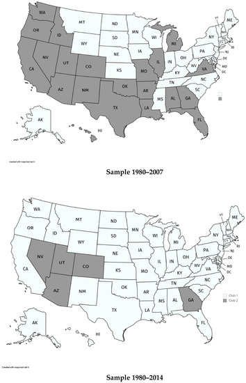 Next, we analyze the existence of convergence clubs in the US States. The results are presented in Panel II of Table 1 and mapped in Figure 1. As can be seen, we have estimated two clubs. Club 1 includes the states with the largest PHCE while Club 2 includes the states with the lowest levels of PHCE. The states in Club 2 for the total sample are AZ, CO, GA, NV and UT, clearly fewer than those in Club 2 for the pre-Great Recession sample (21 states).