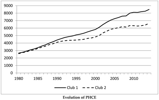 To appreciate the changes caused by the Great Recession, Figure 2 shows the average values of PHCE for the states in club 1 and club 2 when the total sample is considered. We can observe that their growth rates diminished after 2008. However, the states in Club 2 did so more intensively than those in Club 1. Therefore, the distance between the two clubs has augmented in the 2008–2014 period, increasing the divergence between them.