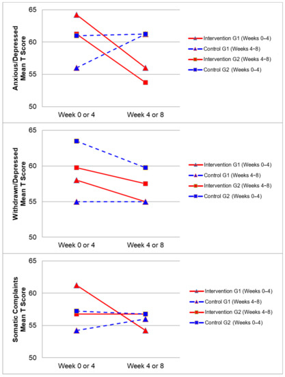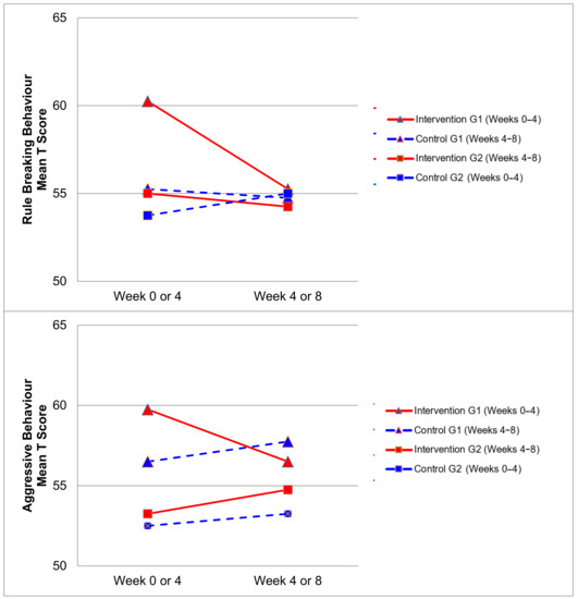 Figure 2, Figure 3, Figure 4 and Figure 5 demonstrate the intervention and control period outcomes for each of the domains and syndromes, using a mean t score for comparison. A reduction in the domain and syndrome t-score value between the two points (weeks 0 or 4 to week 4 or 8) indicates an improvement in the particular domain or syndrome, while an increase indicates a worsening of the domain or syndrome. All three domains displayed a reduction in t score values for both intervention groups (see Figure 5). G1 and G2 exhibited reductions in all syndrome t scores following the intervention period, with the exception of G1 for the Aggressive Behaviour and Somatic Complaints Syndromes (see Figure 2, Figure 3 and Figure 4). G1 also maintained improvements in the Withdrawn/Depressed and Rule Breaking Syndromes over the control period (see Figure 2 and Figure 3).