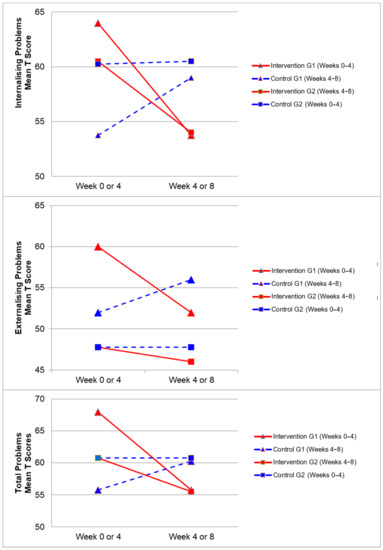 Observed mean scores suggested no noteworthy differences between group 1 and 2 at baseline (week 0) for the percentile scores in the domains listed on the CBCL (see Table 4). Paired samples t-tests between pre intervention scores (G1—week 0 and G2—week 4) and post-intervention scores (G1—week 4 and G2—week 8) revealed significant changes in scores for several domains during the intervention period (see Table 5). Significant improvements were observed in the Anxious/Depressed subdomain (p = 0.02) and the Domain Summary (p = 0.026), both with a large effect size (d = 1.03 and d = 1.06 respectively) for the Internalising Domain. For the other problems sub domains, Thought Problems (p = 0.03) and Attention Problems (p = 0.01) both significantly improved pre- to post-intervention with effect sizes ranging from large (d = 0.82) to medium (d = 0.82) respectively. The Externalizing Problems Domain Summary approached significance (p = 0.06) following the intervention period (see Table 5). Overall, the Total Problems score was found to be significantly improved post-intervention (p = 0.018) with a large effect size (d = 1.04). Additionally, pre control scores (G1—week 4 and G2—week 0) were compared to post-control scores (G1—week 8 and G2—week 4) to examine the control period effect. The paired samples t-tests indicated there was no significant change in scores during the control period.