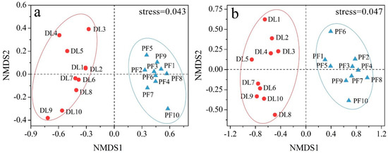 NMDS analysis results of soil (a) bacteria and (b) fungi at the genus level in different land use types.