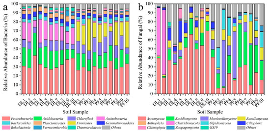 Abundance of soil (a) bacteria and (b) fungi communities for different land use types at the phylum level.
