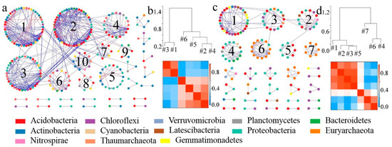 Soil bacterial molecular ecological networks and modular eigengene hierarchy structure in DL and PF. (a) Soil bacterial molecular ecological network in the DL; (b) soil bacterial modular eigengene hierarchy structure in the DL; (c) soil bacterial molecular ecological network in the PF; (d) soil bacterial modular eigengene hierarchy structure in the PF. Note: The connection lines represent the interactions between communities on the phylum level. The blue and red colors indicate positive and negative, respectively (the use of colors remains the same in the following sections).
