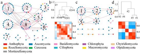 Soil fungal molecular ecological networks and modular eigengene hierarchy structure in DL and PF. (a) Soil fungal molecular ecological network in the DL; (b) soil fungal modular eigengene hierarchy structure in the DL; (c) soil fungal molecular ecological network in the PF; (d) soil fungal modular eigengene hierarchy structure in the PF.
