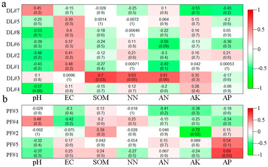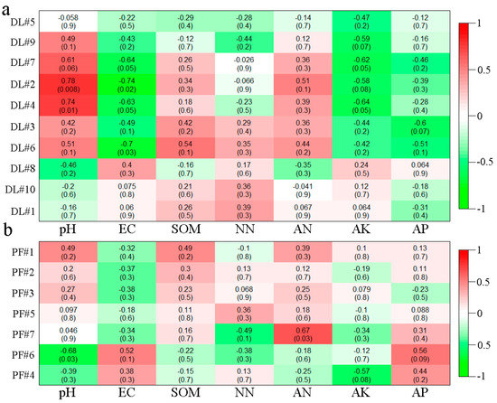 Heatmap analysis of fungal module correlation with environmental factors in DL (a) and PF (b).