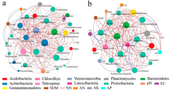 Furthermore, the network interactions between soil microbial species and environmental factors, with environmental factors as the nodes, were analyzed. The top 50 genera of soil microorganisms in dry land and paddy field were selected for the construction of an RMT-based network to compare the relationships between environmental factors and microorganisms. The results are shown in Figure 9. Proteobacteria was the primary species in the constructed networks of dry land and paddy field. Actinobacteria was the dominant species in the constructed network of dry land, but it was not involved in the network of paddy field (Figure 9a). Among the interactions between the dominant bacterial species and environmental factors, the numbers and strengths of nodes connected to soil OM, pH, and EC were the highest. The interactions between AK and AP in paddy field and bacteria were close, showing that soil nutrients such as AK and AP are the main factors promoting the development of bacteria in paddy field (Figure 9b). In contrast, no connections were found between dominant species and environmental factors in the bacterial interaction network of dry land. The connections between soil physical and chemical properties and bacterial species showed that the interactions in this network were dominated by negative correlations. In the interaction network, the environmental factors were located on the perimeter, were closely connected with the dominant species, and affected the critical species located amid the network. In conclusion, OM, pH and EC were more frequently connected in the network of dry land, indicating that OM, pH and EC are the determining factors for the changes of bacterial community structures during the process of dryland-to-paddy conversion.
