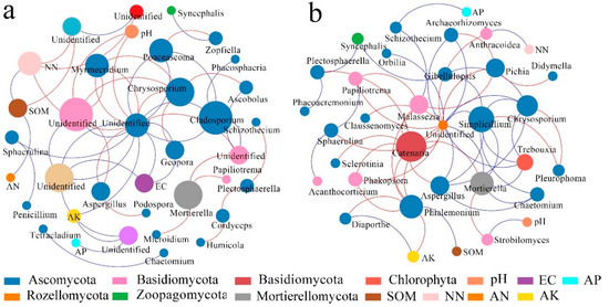 In relation to the interactions between species and environment, Ascomycota was the primary species in the ecological networks of dry land and paddy field (Figure 10). Basidiomycota was the dominant species in the interaction fungal network of paddy field, but Basidiomycota was not involved in the interaction network of dry land, where the numbers and strengths of nodes connected to NN, OM, and EC were the highest, followed by pH and AK, ammonia nitrogen, and AP, successively (Figure 10a). In the fungal network of paddy field, fungi had a significant correlation with AK, and had positive correlations with OM, pH, ammonia nitrogen and AP, but these positive correlations were relatively loose (Figure 10b). In addition, the remaining physical and chemical properties were indirectly related to the dominant species. According to the connections between soil physicochemical properties and soil microbial species, the interactions in dry land fungal networks were dominated by negative correlations, while the interactions in paddy field fungal networks were dominated by positive correlations, demonstrating that the soil bacteria cooperated with each other in order to adapt to the unfavorable stress caused by flooding.