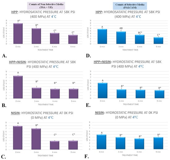 Inactivation of four-strain cocktail of L. monocytogenes (ATCC@ 51772, 51779, BAA-2657, and 13932) in sterilized phosphate-buffered saline, treated by nisin (5000 IU/mL) and elevated hydrostatic pressure at 400 MPa (Barocycler Hub880 Explore, Pressure Bioscience Inc., Easton, MA, USA) for 0, 3, 6, and 9 min at 4 °C. In each graph and for each microbiological medium (PALCAM (selective counts), TSA + YE (nonselective counts)) separately, columns of each time interval followed by different uppercase letters are representing log CFU/mL values (Mean ± SD) that are statistically (p < 0.05) different (Tukey-adjusted ANOVA). Uppercase letters followed by * sign are statistically (p < 0.05) different than untreated control (not treated with antimicrobial) (Dunnett’s-adjusted ANOVA). (A) Nonselective counts (Tryptic Soy Agar + yeast extract [TSA + YE]), treated by hydrostatic pressure at 400 MPa (58 K pound-force per square inch [PSI]) at 4 °C; (B) Nonselective counts (TSA + YE), treated by hydrostatic pressure at 400 MPa (58 K PSI) and exposed to nisin (5000 IU/mL) at 4°C; (C) nonselective counts (TSA + YE), only exposed to nisin (5000 IU/mL) at 4 °C. (D) Selective counts (PALCAM), treated by hydrostatic pressure at 400 MPa (58 K PSI) at 4 °C; (E) Selective counts (PALCAM), treated by hydrostatic pressure at 400 MPa (58 K PSI) and exposed to nisin (5000 IU/mL) at 4°C; (F) Selective counts (PALCAM), only exposed to nisin (5000 IU/mL) at 4 °C.