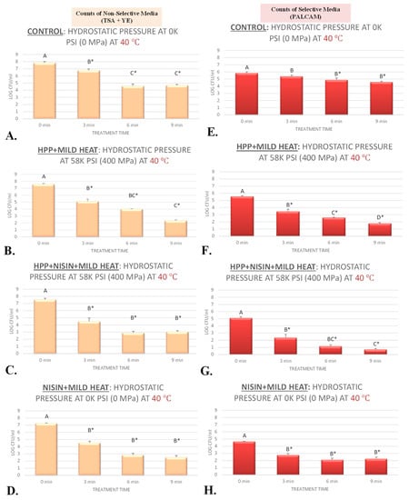 Inactivation of four-strain cocktail of L. monocytogenes (ATCC@ 51772, 51779, BAA-2657, and 13932) in sterilized phosphate-buffered saline, treated by nisin (5000 IU/mL) and elevated hydrostatic pressure at 400 MPa (Barocycler Hub880 Explore, Pressure Bioscience Inc., Easton, MA, USA) for 0, 3, 6, and 9 min at 40 °C. In each graph and for each microbiological medium (PALCAM (selective counts), TSA + YE (non-selective counts)) separately, columns of each time interval followed by different uppercase letters are representing log CFU/mL values (Mean ± SD) that are statistically (p < 0.05) different (Tukey-adjusted ANOVA). Uppercase letters followed by * sign are statistically (p < 0.05) different than untreated control (not treated with the antimicrobial) (Dunnett’s-adjusted ANOVA). (A) Nonselective counts (TSA + YE), treated by heat at 40 °C; (B) Nonselective counts (TSA + YE), treated by hydrostatic pressure at 400 MPa (58 K PSI) and at 40 °C; (C) Nonselective counts (TSA + YE), treated by hydrostatic pressure at 400 MPa (58 K PSI) and exposed to nisin (5000 IU/mL) at 40 °C; (D) Nonselective counts (TSA + YE), exposed to nisin (5000 IU/mL) at 40 °C. (E) Selective counts (PALCAM), treated by heat at 40 °C; (F) Selective counts (PALCAM), treated by hydrostatic pressure at 400 MPa (58 K PSI) and at 40 °C; (G) Selective counts (PALCAM), treated by hydrostatic pressure at 400 MPa (58 K PSI) and exposed to nisin (5000 IU/mL) at 40 °C; (H) Selective counts (PALCAM), exposed to nisin (5000 IU/mL) at 40 °C.