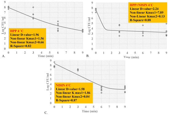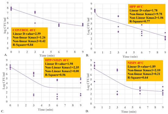 At 4 °C, the D-value and inactivation Kmax for samples treated at 400 MPa for up to 9 min were 1.96 and 1.56, respectively (Figure 3A). This indicates, with assumption of linearity, that every 1.96 min, the treatment is capable of reducing 90% of the inoculated pathogen under the intrinsic and extrinsic conditions of the experiment. Similarly, the above-mentioned treatment in the presence of 5000 IU nisin resulted in D-value and inactivation Kmax of 2.24 and 7.89, respectively (Figure 3B), while exposure to nisin alone yielded D-value and inactivation Kmax of 1.58 and 1.86, respectively (Figure 3C). These findings are in harmony with results of microbial log reductions in Section 3.1, Section 3.2 and Section 3.3, where nisin was efficacious to enhance the decontamination effectiveness of the pressure- and heat-based treatments at a time interval of 3 min but had its efficacy diminished at longer time intervals. At 40 °C, the D-values for heat-treated (40 °C), pressure-treated (400 MPa), pressure-treated with nisin (400 MPa, 5000 IU/mL), and nisin-treated (5000 IU/mL) samples were 2.59, 1.78, 1.98, and 1.89 min, respectively (Figure 4A–D). The inactivation Kmax of the treatments were 1.26, 9.78, 2.35, and 2.10 (Figure 4A–D). Both linear and nonlinear inactivation indices could provide adaptable information for stakeholders’ assimilation, however, it is important to note that inactivation indices would need to be utilized and adapted with caution after studying the pathogen–product specific relationship to assure the most generalizable linear or nonlinear model had been selected [,,].