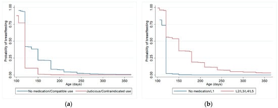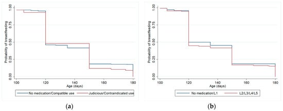 Another strength of this study is the use of two drug classifications according to their safety in lactation: a national classification system used in Brazil and a widely used international classification system. Current information about medicines safety during lactation is conflicting [9,10]. Some important differences between these two classifications were observed, specifically the hormonal contraceptives, pharmacological group widely used by women in reproductive age. According to the Brazilian Ministry of Health criteria, almost 78% of women who used medication used only compatible breastfeeding drugs, whereas in Hale’s classification only 20.5% of women used medicines in the equivalent category (L1). This fact exposes the substantial differences between both criteria. Despite this, in our findings, there was no statistically significant difference in weaning rates between women who did not consume medications or consumed only breastfeeding-compatible medications and among women who took medicines that pose some risk to milk production or risks for the child, for both criteria. Nowadays, there are few studies evaluating the duration of breastfeeding regarding the use of medicines [6,10]. A study carried out in Brazil using American Academy of Pediatrics classification for medicines’ compatibility with breastfeeding (2001) and Hale’s criteria (2004) with a sample of 246 women showed that duration of breastfeeding was longer in women who did not use any medication or who used only medicines compatible with breastfeeding [27].
