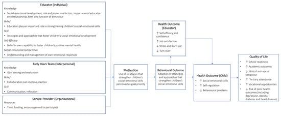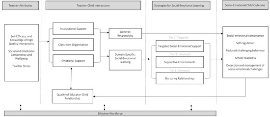 - Blewitt, C.; Morris, H.; Nolan, A.; Jackson, K.; Barrett, H.; Skouteris, H. Strengthening the quality of educator-child interactions in early childhood education and care settings: A conceptual model to improve mental health outcomes for preschoolers. Early Child Dev. Care 2018. [Google Scholar] [CrossRef]