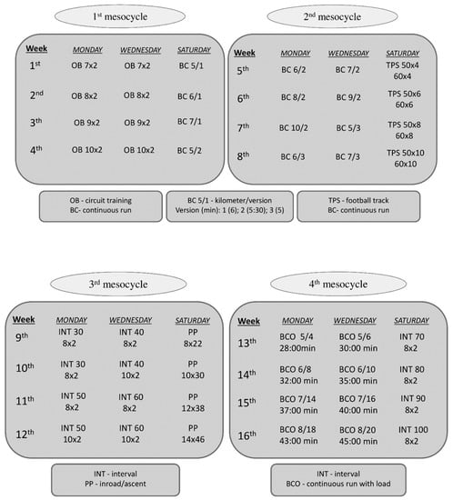 Before and after the 4-month training cycle, tests to determine motor skills (i.e., endurance, pace, and agility) were performed. Each mesocycle was focused on improving a specific component of motor performance and was divided into four stages: (i) circuit training and continuous runs, (ii) football tracks and continuous runs, (iii) uphill and interval running, (iii) running intervals and continuous runs with a load.