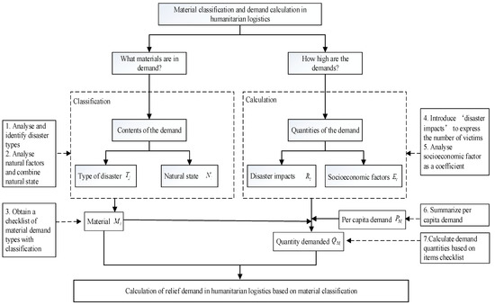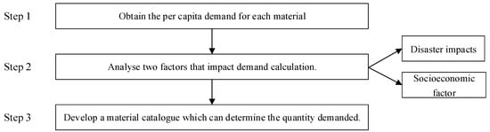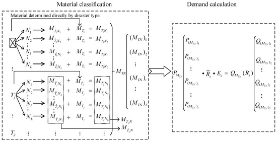 Relief demand calculation involves two key questions: (1) What items are in demand? (2) How high are the demands? Establishing a material catalogue that basically covers victims’ requirement in clothing, food, shelter, and medical service in a HL operation is the answer to the first question [57,58]. The second question refers to the total quantity of each material to be delivered to the victims. The aspects of content and quantity of demand are focused on to answer the two questions.