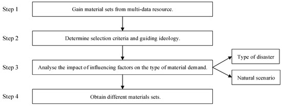Researchers and relief decision-makers share the knowledge that required supplies are varied, complicated, and disordered because of the occurrence of disasters, which disrupt routine/normal living conditions [64]. These complex characteristics become obstacles to HL and hinder the improvement of logistics efficiency. Scanning and sorting relief supplies are essential to ensure the effective implementation of disaster relief operation. The optimal solution is to create a material catalogue and apply it to the real world. This solution can improve the efficiency of HL through logistics means and modern supply chain theory. Figure 3 provides the steps to create this catalogue.