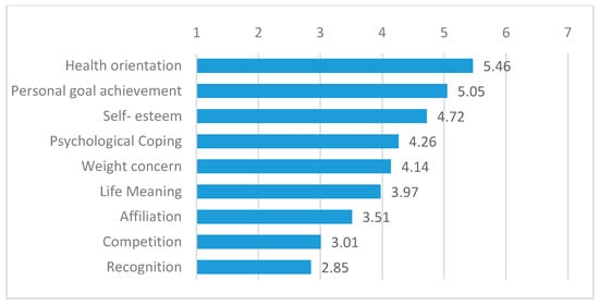 Figure 1 shows the average motivational scores for the nine dimensions of the MOMS in a descending order. General health orientation was the highest motivation to participate (5.46), followed by personal goal orientation (5.05) and self-esteem (4.72). Psychological coping (4.26), weight concern (4.14) and life meaning (3.97) showed slightly lower values, closer to four. Affiliation (3.51), competition (3.01) and recognition (2.85) had the lowest scores among participants as motivations for practising this sport.