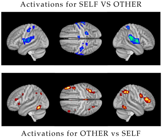 Significant activations were found for both levels of the Identity factor (Figure 2). Greater activation for SELF versus OTHER was found bilaterally in the dorso-lateral fronto-parietal cortex, and in the occipito-temporal cortex, including in particular the fusiform gyrus. In turn, OTHER significantly activated more than SELF the bilateral sensorimotor cortices, the superior temporal gyrus, and the insula.