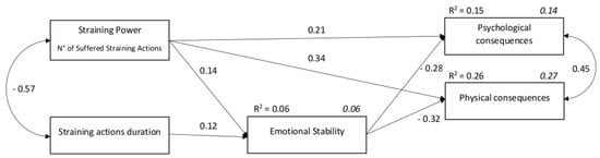 We then revised the model, removing non-significant relationships (straining duration on psychological and physical consequences) (Model 2). The fit indices were overall acceptable: RMSEA = 0.088; CFI = 0.924; NFI = 0.942; SRMR = 0.060; χ2/df = 14.3, p < 0.001. The path diagram is shown in Figure 2.