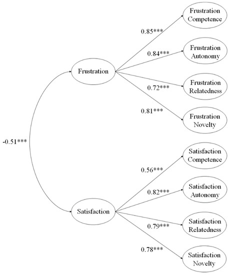 Once the model was determined, a higher order model was tested (e.g., the eight first order factors converging into two higher order factors called frustration and satisfaction). The adjustment indices of this model are as follows (Figure 2): χ2 (551. N = 2372) = 958.04, p < 0.001; χ2/df = 1.74; CFI = 0.96; IFI = 0.96; RMSEA = 0.052 (CI 90% = 0.047–0.058); SRMR = 0.041. All standardized regression weights were significant (p < 0.001), with 0.85 for frustration of competence, 0.84 for frustration of autonomy, 0.72 for frustration of relatedness, 0.81 for frustration of novelty, 0.56 for satisfaction of competence, 0.82 for satisfaction of autonomy, 0.79 for satisfaction of relatedness, and 0.78 for satisfaction of novelty. As for the correlations between the higher order factors, they were −0.51, being statistically significant (p < 0.001).