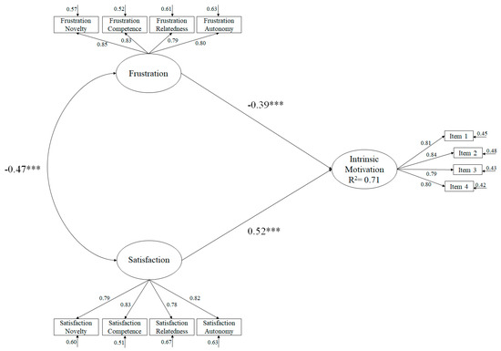 Finally, evidence of predictive validity for the scale was found through the structural equation model. This analysis showed that each of the factors pertaining to the satisfaction of basic psychological needs positively predicted the intrinsic motivation, while the frustration of basic psychological needs predicted it negatively. These results are similar to previous studies where satisfaction of psychological needs was positively related to intrinsic motivation [33,34] and frustration of psychological needs was negatively related to intrinsic motivation [35,36]. These relationships appear to support the postulates of SDT that the frustration of psychological needs may lead to the search for a collateral satisfaction that compensates for this feeling of frustration by producing a series of disadaptive consequences or inhibition that may be contrary to personal well-being, and conversely, the satisfaction of basic psychological needs is closer to adaptive behaviors and continued participation that promote personal well-being [37].