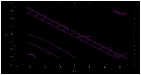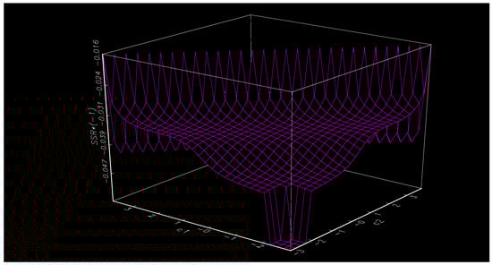 It is necessary to estimate the parameters of the STR model after the determination of the conversion form of the function and the conversion variables. According to the systematic grid search method, the chosing of the initial estimate of (location parameter) and (smoothing parameter) are performed by selecting different and within a certain range so that the sum of squared residuals estimated by the STR model system is the smallest. As shown in Table 4, the interval of the smoothing parameter is set to be (0.50, 10), and the interval of the positional parameter is (−3.38, 3.47) (the smoothing parameter interval and the position parameter interval are set based on the model system data change and the conversion variable empirical data range, respectively), and the value of and are both 30, which constitutes a combined point of 30 × 30 . All the two-dimensional space combination points are evaluated one-by-one to find the parameters with the smallest residual square sum as the initial estimate value for further optimization. The initial estimates of and are shown in the table below. Figure 1 and Figure 2 are contour plots and plans, respectively, under the help of two-dimensional grid search method, and the plan is the inverse of the maximize residuals.