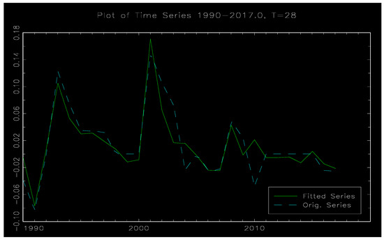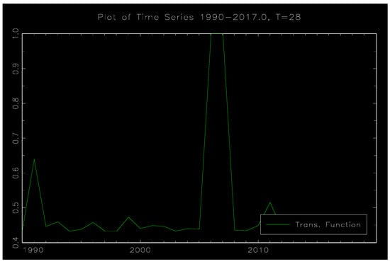 Figure 4 and Figure 5 show schematic diagrams of the model nonlinear function and the transfer function . Figure 4 is the result of the transfer function in which is treated as the conversion variable. The horizontal axis represents the conversion variable and the vertical axis represents the conversion function . It can be seen that the value interval of the conversion function is 0–1, and the symmetry about . Figure 5 is the time series diagram of the transfer function, and it clearly shows there are obvious phase characteristics between environmental regulation and social employment. Specifically, it can be divided into three stages: 1990–2004, 2005–2008, and 2009–present. Among them, the values of in the two periods from 1990 to 2004 and 2009 to present are relatively small and show the linear performance. The lagging period of environmental regulation is negatively correlated with the unemployment rate, which indicates that such environmental regulation is conducive to the improvement of social employment in the long run. In 2005–2008, during the ‘Eleventh Five-Year Plan’ period, there was an obvious nonlinear characteristic between environmental regulation and social employment . At this time, the coefficient of is 0.73682, and the coefficient of is 1.42287. The coefficient of the environmental regulation lags from the first phase is changed from the negative value of the linear part (such as Equation (9)) to the positive value, demonstrating the positive correlation between the environmental regulation lag phase 1 and the social unemployment rate, which is unfavorable to the improvement of the social employment level. We assume that the change in the coefficient is mainly affected by the domestic environmental protection situation. The ‘Eleventh Five-Year Plan’ is the period in which China’s environmental protection situation has taken turns, and the ‘environmental storm’ has become the key word during the ‘Eleventh Five-Year Plan’ period. The five-year environmental plan is considered to be the best environmental plan for the past years at the government work evaluation meeting. During the ‘Eleventh Five-Year Plan’ period, the Ministry of Environmental Protection will not accept and approve the investment of more than 2.9 trillion yuan for 813 projects that do not meet the environmental protection requirements. At the same time, it will investigate and deal with heavy metal pollution, papermaking enterprises, sewage treatment plants, etc., and shut down more than 20,000 illegal sewage companies. The long-term and super-level improvement of environmental regulation has led to a large loss of social employment. Therefore, during the period, whether it is the current period of environmental regulation or the first period of lag, there is a significant positive correlation between the unemployment rate.