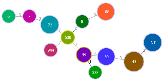 - Enright, M.C.; Day, N.P.; Davies, C.E.; Peacock, S.J.; Spratt, B.G. Multilocus sequence typing for characterization of methicillin-resistant and methicillin-susceptible clones of Staphylococcus aureus. J. Clin. Microbiol. 2000, 38, 1008–1015. [Google Scholar] [CrossRef]