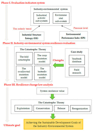 This paper mainly focuses on the coupling law of industry–environmental system and look forward to finding a new way for the sustainable development of the industrial economy. Since there are respective interests of the two major themes of industrial development and environmental protection, this paper chooses to conduct a resilient evaluation of the entire industry–environmental system from the resilient perspective. The catastrophe theory and the adaptive cycle model were used to analyze how to find a balance between the industry and the environment. Therefore, establishment of comprehensive evaluation model considers the contribution of various factors in the industrial activity sub-system and the environmental sub-system to the resilience. The framework of the comprehensive evaluation model is summarized in Figure 1 with the following three research phases.