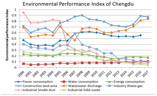 Since 2000, the environmental pressure of the three indicators of industrial pollution emissions has decreased significantly, indicating that environmental protection policies and industrial transformation are gradually releasing the pressure of environmental pollution. The performance of industrial smoke dust and industrial waste gas is the most obvious. However, the EPI of the three environmental factors, that is, electricity consumption, sewage discharge, and construction land fluctuated greatly. In the meantime, there was a slight upward trend, which indicates it is necessary to improve the economic utilization of electricity and land resources, and strengthen the governance of wastewater discharge problems. This situation may be the result in rapid urban expansion and the vigorous development of high-tech industries. Simultaneously, during the research period, the EPI of energy consumption was relatively stable and slightly decreased, indicating that the adjustment of industrial structure is gradually reducing the dependence of economic growth on resource-dependent industrial development, such as heavy industry. What is more, it also reflects the higher level of energy resource utilization. Due to the superior environmental location of the Chengdu Plain, water resources have remained stable and low for a long term. Also, abundant water resources greatly promoted Chengdu’s industrial development.