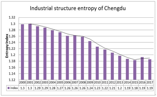 The ISE is calculated by the four types of indicators, that is Chengdu’s primary industry output value, secondary industry output value, tertiary industry output value, and industrial gross output value from 2000 to 2017. The calculation results reflect the changes in the industrial structure adjustment of Chengdu. In the past 20 years, the industrial structure of Chengdu has become more and more stable. According to the calculation results of ISE based on the Equation (4), the change index of industrial structure from 2000 to 2017 is shown in Figure 5.