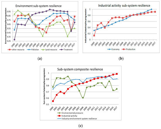 The industrial activity sub-system is different from the fluctuation of the environmental sub-system. The resilience value of the industrial sub-system is shown in Figure 6b as an increasing trend. Only the indicators show that the industrial structure suddenly dropped in 2002–2003. During the period, Chengdu industrial restructure was carried out for the first time, and the major strategic decision of structural adjustment of the eastern suburb industrial zone was implemented. The trend then quickly turn a reorganization phase in which the resilience value continued to increase steadily. The resilience of the industrial activity sub-system is also affected by the industrial structure indicators, and there was a small drop between 2002 and 2003, which was also due to the changes in agricultural restructuring. The industrial structure adjustment gradually reduced the proportion of the primary industry. Among these influencing factors, the industrial structure is the key dominant factor of the industrial activity sub-system when the system is in the lowest or highest resilient state. Overall, the industrial activity sub-system has experienced a relatively stable upgrade and transformation, and the adaptability has been significantly improved.