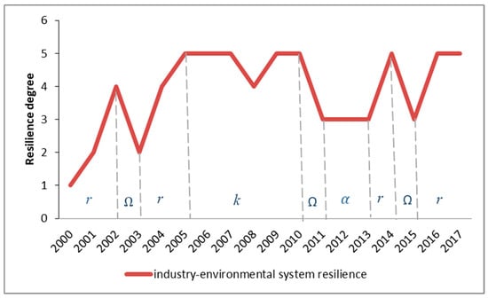 According to the K-means clustering analysis, the line chart of the industry–environmental system resilience from 2000 to 2017 is drawn as Figure 7 below. The variation of the line chart uses the four stages of the adaptive cycle model to analyze the changes in resilience.