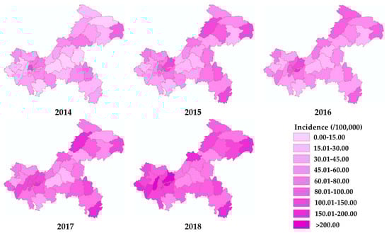 Incidence maps of varicella in Chongqing from 2014 to 2018.
