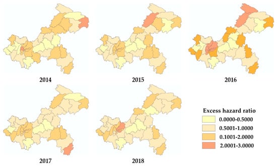 Excess hazard maps of varicella in Chongqing from 2014 to 2018.