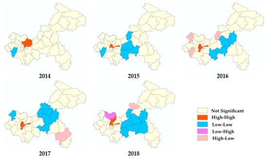 Local spatial autocorrelation cluster maps of varicella in Chongqing in 2014–2018.