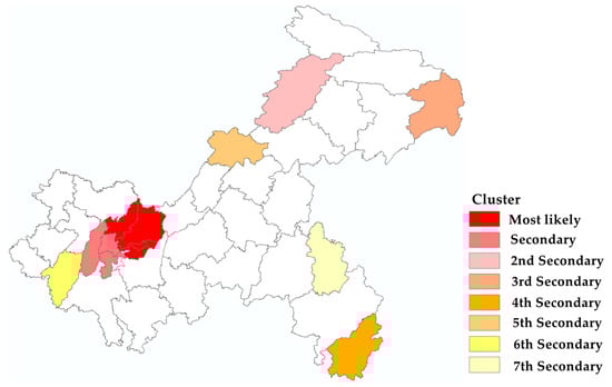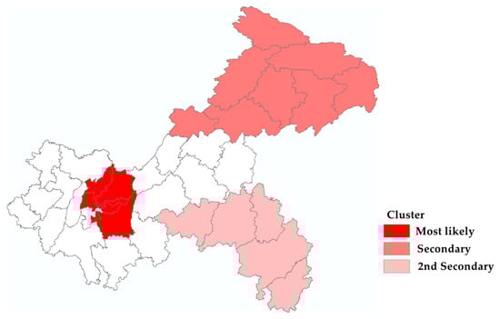 Three statistically significant spatiotemporal clusters were identified by the space-time scan (Figure 6 and Table 4). The most likely cluster occurred between October 2016 and December 2018, including eight of the nine main urban districts of Chongqing. The secondary cluster (n = 8) and the second secondary cluster (n = 5) were mainly in the northeast from October 2018 to December 2018 and in the southwest of Chongqing from November 2017 to December 2017.