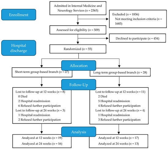 From September 2017 to July 2018, a total of 509 (21.5%) patients admitted to the Internal Medicine and Neurology services of the HUA were screened for eligibility. Among the evaluated patients, 55 started the program (Figure 1). According to hospital admission records, 41.8% admissions were infection-related, 18.2% were due to stroke without motor impairment, 16.4% were decompensated heart failure admissions, and 5.5% were due to falls. The remaining 18% of the admissions were due to other conditions (neurological, delirium, anemia, etc.). Of the 55 patients (26 females, 47.3%) that were initially enrolled, 19 (SGB = 8 and LGB = 11) were lost to follow-up before the 12-week time point. The total number of subjects lost to follow-up at the 24-week time point was 26 (SGB = 11 and LGB = 15, Figure 1). The descriptive characteristics of the study participants are explained in Table 1. No significant differences between the two groups existed at baseline. The program was ceased before reaching the estimated sample size because the difficulties in the recruitment. In addition, at that moment, the primary outcome measure was far from the expected difference between the two assessed interventions.