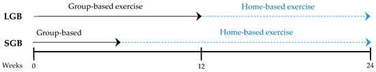There are slight differences between the groups in their effects on QoL. Intriguingly, the LGB had a significant increase in QoL at 12 weeks, just when the group-based period finished. It should be noted that SGB had finished its group-based program six weeks before. In contrast, during the home-based period of the LGB, QoL tended to decrease. These results suggest that group-based interventions could be superior to home-based exercises in improving QoL, as proposed in patients with cancer [] and in elderly people with sarcopenia []. The presence of a social element in group-based interventions could explain this difference. However, the absence of group-by-time interaction in our results makes us cautious with any interpretation; more data are needed to clarify this observation.