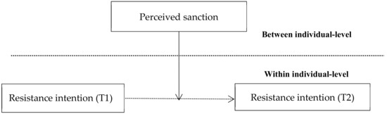 To test Hypotheses 2 and 3, a multi-level linear growth model was adopted using HLM software version 6 (Scientific Software International Inc., Lincoln-wood, IL, USA). Applying the multilevel linear growth model can solve two major problems: data nesting with hierarchical structure and repeated measurement or longitudinal research. Consequently, this method helps to compensate for the errors and limitations of the general regression. The data from repeated measurement can also be regarded as nested data with a hierarchical structure [40]. Using a multi-level linear growth model, the trend in individual development (persons within groups) and their own differences (measures within persons) can be analyzed accordingly. The second problem was identified in our research design (Figure 2), therefore, hierarchical linear growth modeling was used to examine the hypotheses. Although a longitudinal study design was adopted, each wave of variables was collected from the same source (except individual performance), which increased the possibility of common method variance [40]. The empirical distinctiveness of variables at Times 1 and 2 was assessed via CFA. The results are presented in Table 1, which supports the hypothesized factor structure for both Time 1 and Time 2, indicating that the current measures possess adequate discriminant validity [32]. Because within-individuals were nested in individuals, we used hierarchical linear growth modeling to examine the effects of perceived sanction on resistance intention development over time [40]. Level 1 represented a within-individual change from Time 1 (T1) to Time 2 (T2), taking time as the independent variable (Table 4, model 2). Level 2 added perceived sanction to the model and individual-level control variables (model 4) and examined whether perceived sanction moderated the effect of resistance intention (T1) on resistance intention (T2).