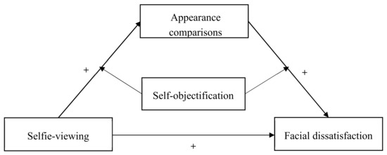 The tripartite influence model also indicates that, between sociocultural sources, namely peers, family, and media, and people’s development of body dissatisfaction, one of the two mechanisms that play the mediating roles is appearance comparisons [17]. Consistent with this theory, studies have supported the mediating role of appearance comparisons in the association between media exposure (including social media use) and body dissatisfaction [24,25,26,27] (Fardouly and Vartanian, 2015; Myers and Crowther, 2007; Slevec and Tiggemann, 2011; Tiggemann and Zaccardo, 2015). Specifically, those who view attractive images of others often judge themselves as being less attractive, which can cause them to feel worse about their appearance [24,28]. Following this rationale, it is possible that appearance comparisons would mediate the relationship between selfie-viewing and facial dissatisfaction.