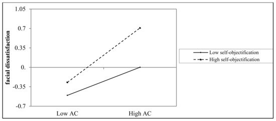 In addition, the path from appearance comparisons to facial dissatisfaction may also be moderated by self-objectification. Previous studies have shown that self-objectification is associated with body dissatisfaction [25,42,43,44]. Moreover, as Quinn, Chaudoir, and Kallen [45] stated, social comparison serves as a way for self-objectified individuals to monitor their appearance. In other words, though appearance comparisons might cause people’s facial dissatisfaction, the degree of impact may differ depending on their levels of self-objectification. Through the process of comparison, people become aware of the disparity between themselves and the comparison targets. Subsequently, self-objectified individuals who are more concerned about physical appearance may feel more dissatisfied if they judge themselves to be worse off than the target.