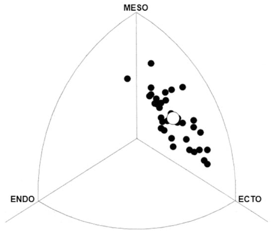 Somatotype distribution seen in young elite runners (n = 90). O = mean somatotype = 1.7-3.8-3.8 (endomorph, mesomorph, ectomorph).