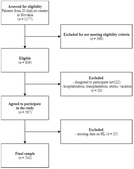 We included 567 dialyzed patients (70% of those approached), and 25 patients were excluded due to missing data on HL. The final sample consisted of 542 patients (Table 1).