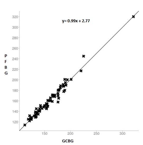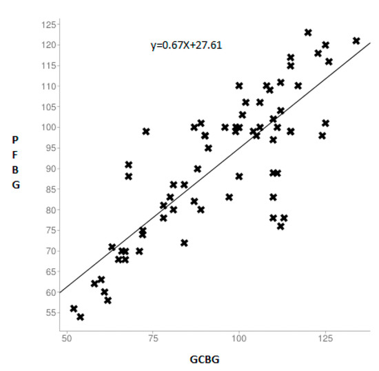 Scatter plot of the linear relationship between the glucose measurements of the gingival blood and capillary finger-stick method in the diabetic group. GCBG: comparison of gingival crevicular blood glucose.
