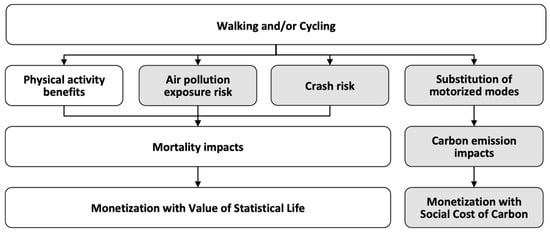 - Impacts that should be considered, namely for the physiological pathways of exposure to physical activity, air pollution, crash risks, and/or carbon emissions.